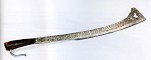 Foto 4: "Beidana", arma bianca popolare tipica dei Valdesi del Piemonte, della seconda metà del XVII secolo o della prima metà del XVIII. L'esemplare è piuttosto ricco, decorato a bulino con un motivo semplice ma non privo di eleganza. Le armi di questo genere più tipiche portano all'estremità una voluta ricavata per forgiatura, voluta che qui è simulata col bulino. Anche il traforo a cuore è un motivo caratteristico. L'impugnatura è costituita da due guancette di corno bovino. Subito sotto l'impugnatura, sul lato sinistro (qui non illustrato), è presente un gancio piatto per essere appesa alla cintura. Descrizione di Giorgio Dondi. Lunghezza totale dell'arma cm 70,8. Museo d'Artiglieria di Torino, 02.01.0039. Foto Maria Vernetti.